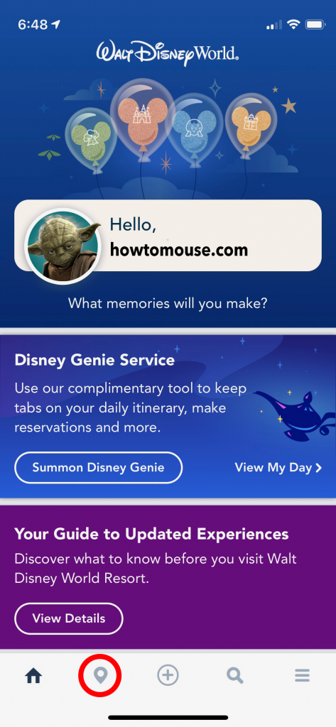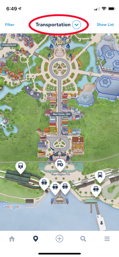 - Know what’s available. There are only four modes of transportation Disney World offers to get you from place to place around the kingdom (I’ve always enjoyed referring to Disney World as “the kingdom”): buses, boats, the Skyliner, and the Monorail. Knowing the options available at the resorts and parks is a key in planning. So where can you find these options? The best place is the My Disney Experience app. On the home screen (figure 1) tap the waypoint at the bottom (circled in red). When the map pops up (figure 2) tap on the drop down menu (again, circled in red) and select transportation. You can now navigate to any location in the entire kingdom to discover what transportation is available. If you prefer not to use the ease and convenience of the My Disney Experience app, you can always check with any Guest Services location, your best friends at Disney World.